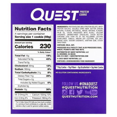 Описание товара Quest Nutrition, Протеиновое печенье, двойная шоколадная крошка, 4 пакетика, 59 г (2,08 унции)