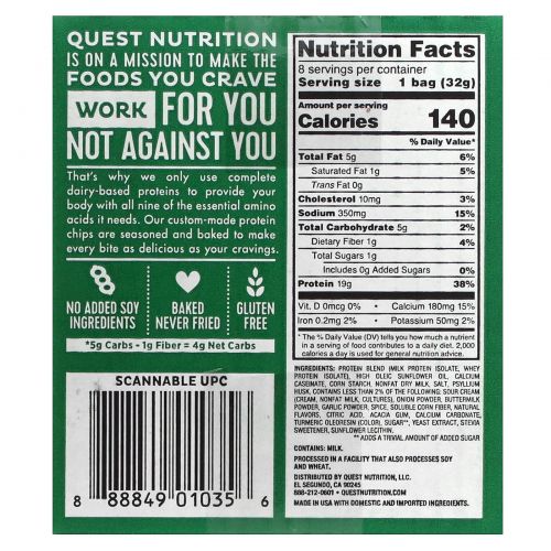 Описание товара Quest Nutrition, Протеиновые чипсы Original Style, сметана и лук, 8 пакетиков по 32 г (1,1 унции)