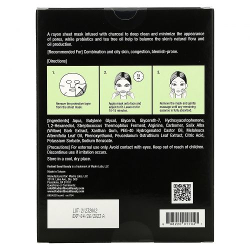 Тканевые маски с древесным углем для восстановления баланса кожи Radiant Seoul Beauty™ рекомендуются для очищения закупоренных пор и улучшения состояния комбинированной и жирной кожи, склонной к высыпаниям. Маски из вискозного полотна с древесным углем помогают глубоко очистить и сократить размер пор, а пробиотики, кора ивы и масло чайного дерева восстанавливают баланс естественной микрофлоры кожи и нормализуют выработку жира.