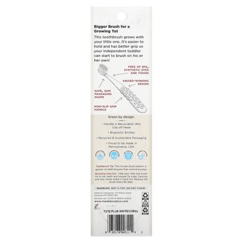 Описание товара RADIUS, Totz Plus, зубная щетка, для детей от 3 лет, экстрамягкая, коралловая, 1 шт.
