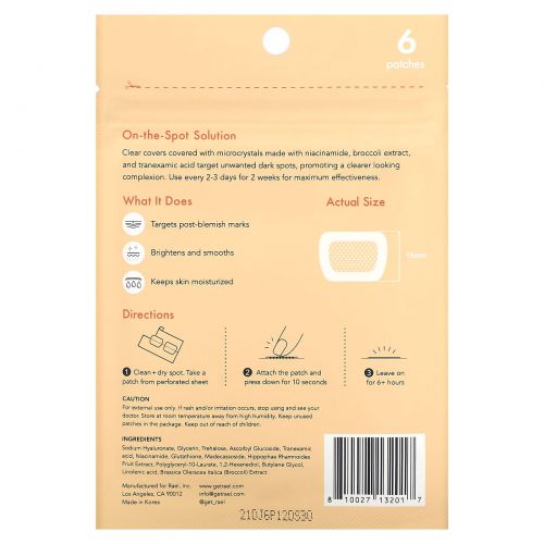Прозрачные покрытия, покрытые микрокристаллами из ниацинамида, экстракта брокколи и транексамовой кислоты, удаляют нежелательные пигментные пятна, улучшая цвет лица. Для максимальной эффективности используйте каждые 2–3 дня в течение 2 недель.