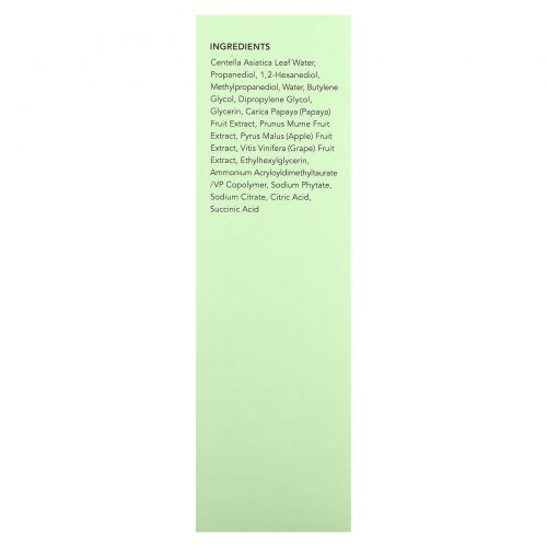 Другие ИнгредиентыВода из листьев центеллы азиатской (Centella asiatica), пропандиол, 1,2-гександиол, метилпропандиол, вода, бутиленгликоль, дипропиленгликоль, глицерин, экстракт плодов папайи (Carica papaya), экстракт плодов абрикоса (Prunus mume), экстракт яблока (Pyrus malus), экстракт плодов винограда (Vitis vinifera), этилгексилглицерин, аммоний акрилоилдиметилтаурат/ВП сополимер, фитат натрия, цитрат натрия, лимонная кислота, янтарная кислота.