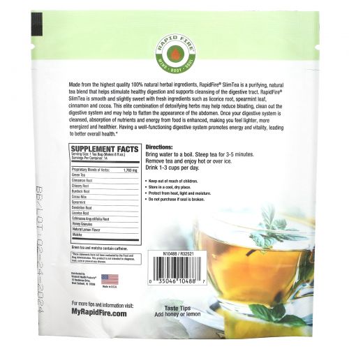 Описание товара RAPIDFIRE, SlimTea, 14 Day Herbal Teatox, Matcha Tea, Real Lemon Flavor, 14 Tea Bags