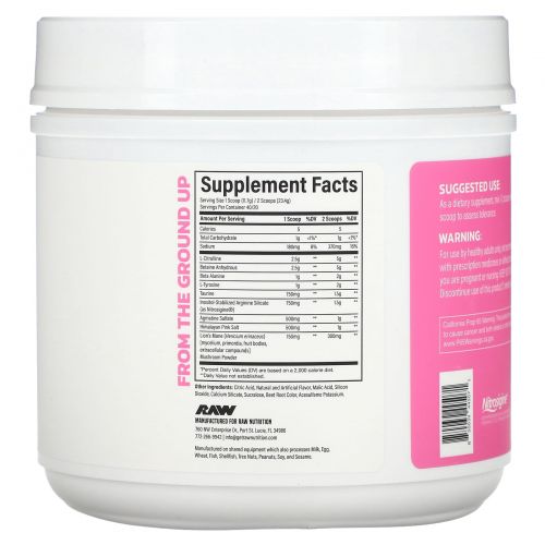 Описание товара Raw Nutrition, Pump, без стимуляторов, со вкусом малинового лимонада, 468 г (1,03 фунта)