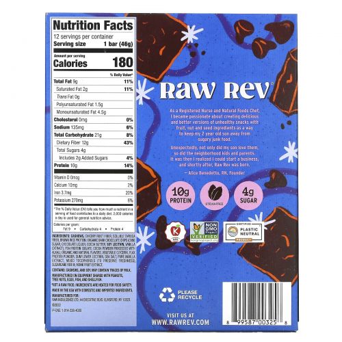 Смесь Raw Rev следующего поколения (сырые орехи кешью, белок гороха, белок коричневого риса, сырое органическое кокосовое масло, сырые органические семена чиа, сырые органические проросшие семена льна), изомальтоолигосахариды (из маниоки / тапиоки), органический темный шоколад (тростниковый сахар , шоколадный ликер, соевый лецитин, экстракт ванили), натуральный какао-порошок, натуральные ароматизаторы, морская соль.