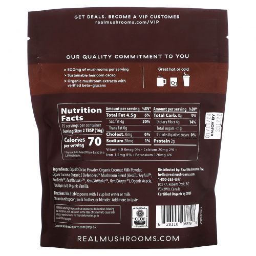 Описание товара Real Mushrooms, Горячий шоколад с грибами и 5 защитниками, несладкий, 240 г