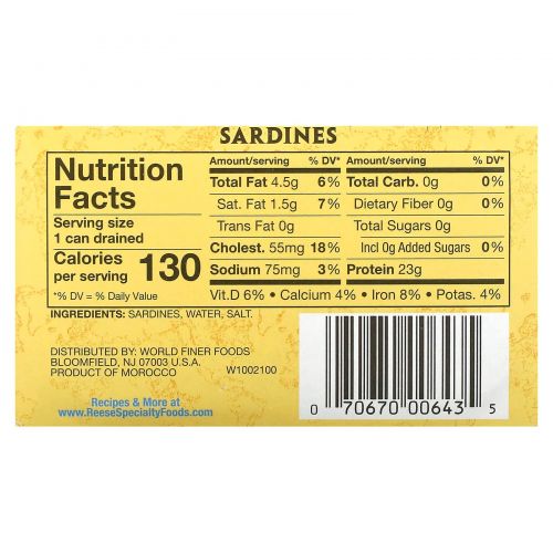 Описание товара Reese, Skinless & Boneless Sardines in Water, 4.375 oz (125 g)