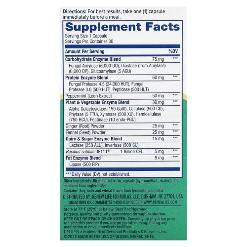 Описание товара Renew Life, Digestive Duo Probiotic + Enzymes, 30 вегетарианских капсул