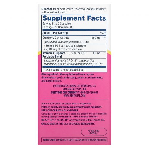 | Cranberry Concentrate (Vaccinium macrocarpon) (whole fruit) » (from a 50:1 extract, equivalent to 25,000 mg of fresh cranberries) | 500 mg | *** |