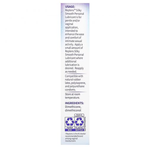 Смазка для личного ухода Replens™ «Шелковая гладкость» предназначена для нанесения на пенис и/или вагину и обеспечивает легкость и комфорт во время интимной активности. Нанесите небольшое количество смазки Replens шелковистой гладкости там, где желательна дополнительная смазка.