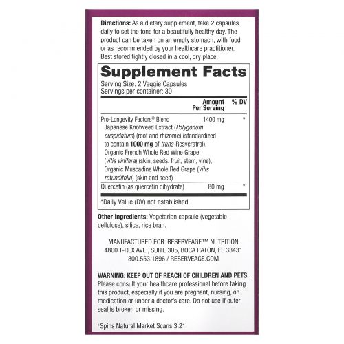Описание товара Reserveage Beauty, ресвератрол, транс-ресвератрол, 1000 мг, 60 растительных капсул (500 мг в 1 капсуле)