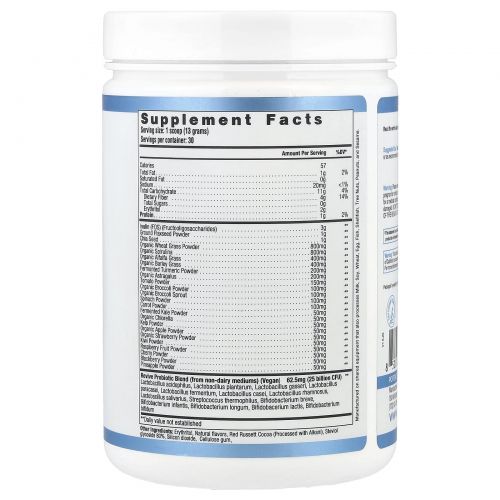 Каждая порция порошка с зеленью от Revive Supplements ежедневно содержит 3 г зелени, богатой питательными веществами, включая ростки пшеницы, спирулину и хлореллу, которые богаты витаминами, минералами и антиоксидантами. Эта добавка также обогащена пищеварительными ферментами, пребиотиками и пробиотиками, которые помогают поддерживать здоровое пищеварение и здоровье кишечника.