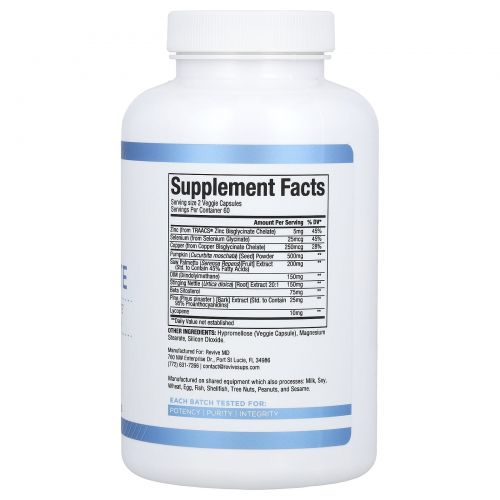 Каждая порция Revive Supplements Revive Supplements содержит эффективную смесь серенои, экстракта семян тыквы и бета-ситостерола. Было доказано, что эти ингредиенты поддерживают здоровую функцию предстательной железы и способствуют здоровому мочеиспусканию.