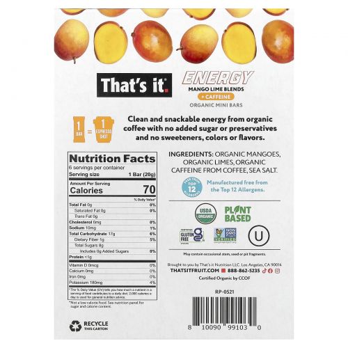 Описание товара That's It, Energy, органические мини-батончики, смесь манго и лайма, 6 мини-батончиков, 20 г (0,7 унции)