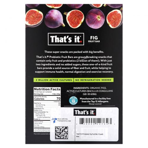 Описание товара That's It, фруктовый батончик с пребиотиками и пробиотиками, инжир, 12 батончиков по 35 г (1,2 унции)