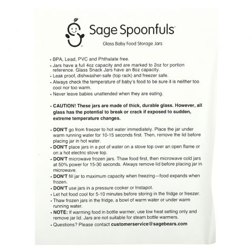 Описание товара Sage Spoonfuls, Glass Baby Food Storage Jars, 6 Pack, 4 oz Each