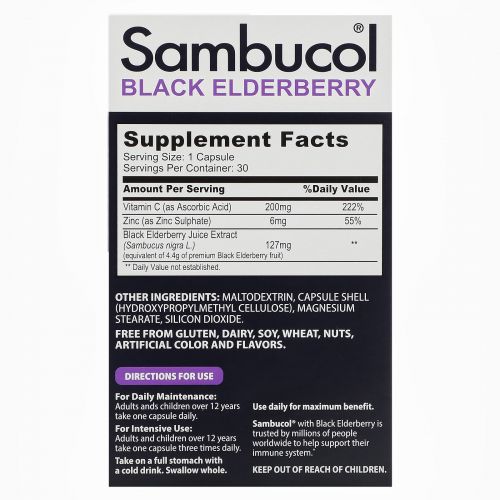 Описание товара Sambucol, Black Elderberry Capsules, Advanced Immune + Vitamin C + Zinc, 30 Capsules
