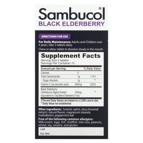 Описание товара Sambucol, Черная бузина для укрепления иммунитета, Оригинальная формула, 30 жевательных таблеток