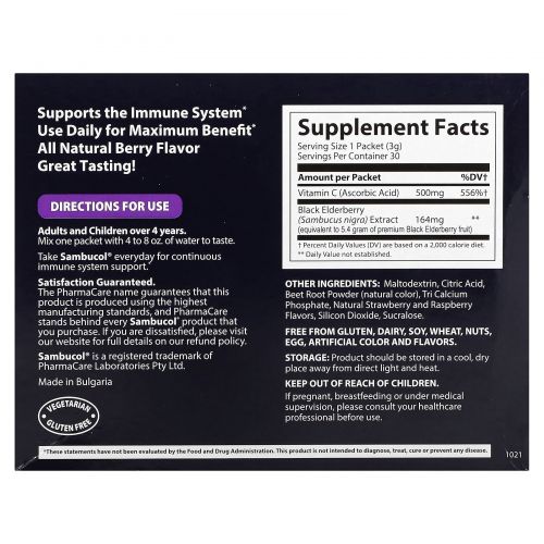 Описание товара Sambucol, Черная бузина, ежедневный напиток для иммунитета, натуральные ягоды, 30 пакетиков по 3 г (0,1 унции)