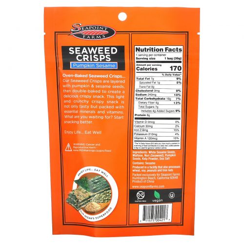 Описание товара Seapoint Farms, Хрустящие морские водоросли, тыквенные семечки и кунжут, 1,2 унции (35 г)