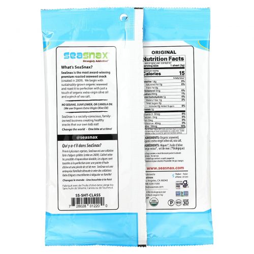 SeaSnax - самая титулованная закуска из жареных морских водорослей (создана в 2009 году). Мы начинаем с экологически чистых органических водорослей и обжариваем их до совершенства с использованием всего лишь небольшого количества органического оливкового масла первого холодного отжима и щепотки морской соли.