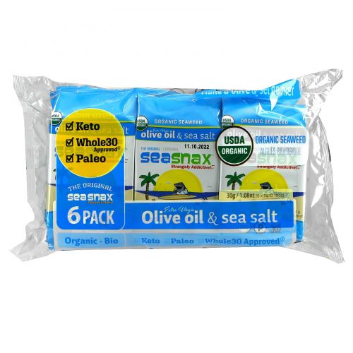 Описание товара SeaSnax, Оригинальная закуска из морских водорослей, 6 штук в упаковке по 0,18 унций (5 г) каждая
