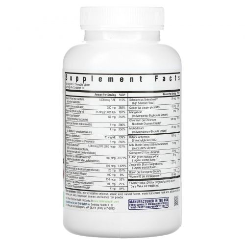 Витамин A включен в две формы: бета-каротин и ретинилпальмитат, чтобы помочь тем, у кого есть проблемы с преобразованием соединений «провитамина A» (таких как бета-каротин) в активные формы ретинила / ретинола. Витамин C и коэнзим Q10 обеспечивают антиоксидантную поддержку, поддерживая здоровую иммунную систему и целостность клеток. Микроэлементы содержатся в их хелатных формах, поскольку минералы в хелатных аминокислотах обычно хорошо усваиваются и могут переноситься легче, чем альтернативные формы добавок. Безводный бетаин (TMG) также добавляется для дополнительной поддержки метилирования.