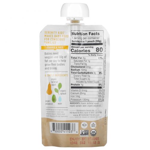 Описание товара Serenity Kids, Organic Butternut Squash & Spinach with Avocado Oil, 6+ Months, 3.5 oz (99 g)