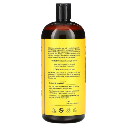 Описание товара Seven Minerals, Масло из виноградных косточек, холодного отжима, чистое, без запаха, 950 мл (32 жидк. Унции)