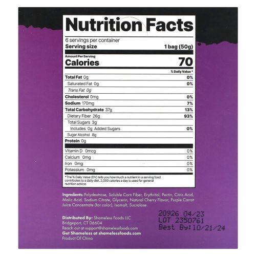 Описание товара Shameless Snacks, суперкислая жевательная конфета, со вкусом вишни, 6 пакетиков по 50 г (1,8 унции)