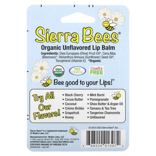 Описание товара Sierra Bees, Органические бальзамы для губ, без вкуса, 4 шт. в упаковке, 0,15 унции (4,25 г) каждый