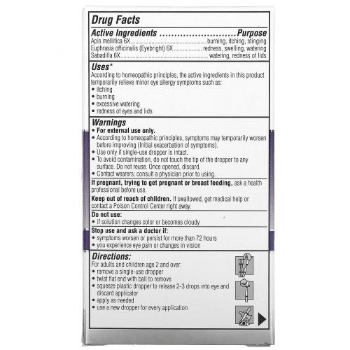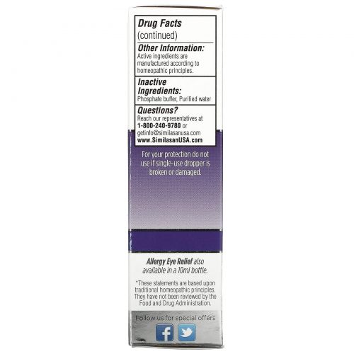 Описание товара Similasan, Противоаллергенные глазные капли, 20 стерильных одноразовых флаконов-капельниц, 0,014 жидкой унции (0,4 мл) каждый