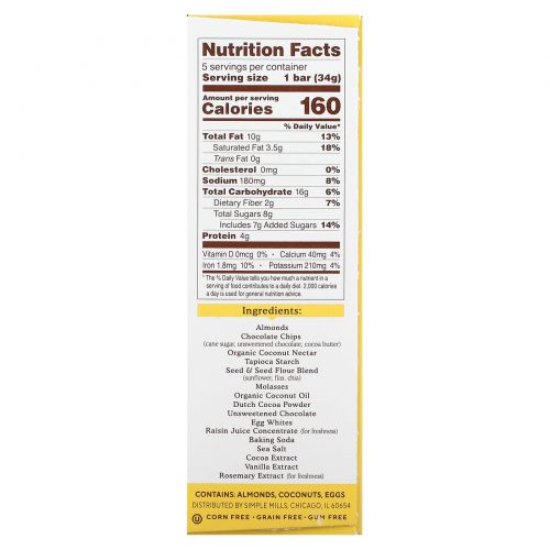 Описание товара Simple Mills, Батончики из запеченной миндальной муки, шоколадный брауни, 5 батончиков по 34 г (1,19 унции)