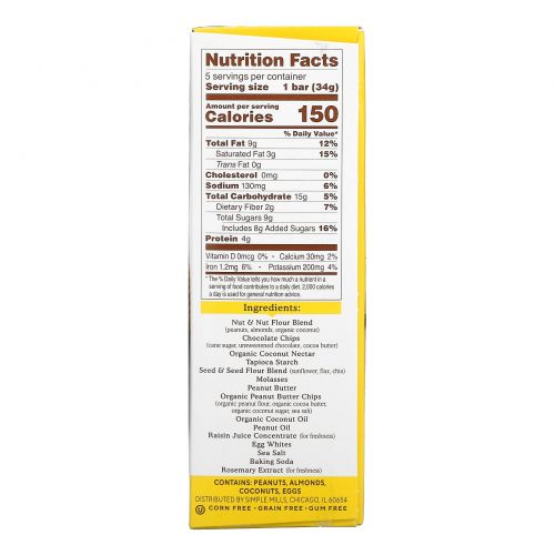Описание товара Simple Mills, Мягкие батончики из запеченной миндальной муки, арахисовая паста и шоколадная крошка, 5 батончиков по 34 г (1,19 унции)