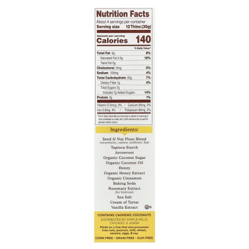 Описание товара Simple Mills, тонкое медовое печенье с корицей, с мукой из орехов и семян, 120 г (4,25 унции)