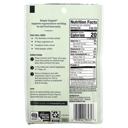 Описание товара Simply Organic, Fajita Seasoning Mix, 12 Packets, 1 oz (28 g) Each