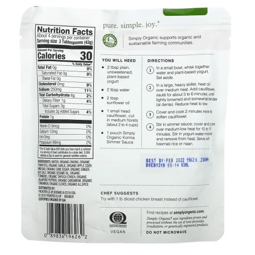 Описание товара Simply Organic, Korma Simmer Sauce, Indian Dishes, 6 oz (170 g)