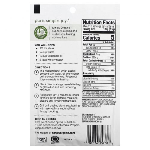 Описание товара Simply Organic, Смесь специй для маринада «Пикантный стейк», 12 пакетиков, 20 г каждый