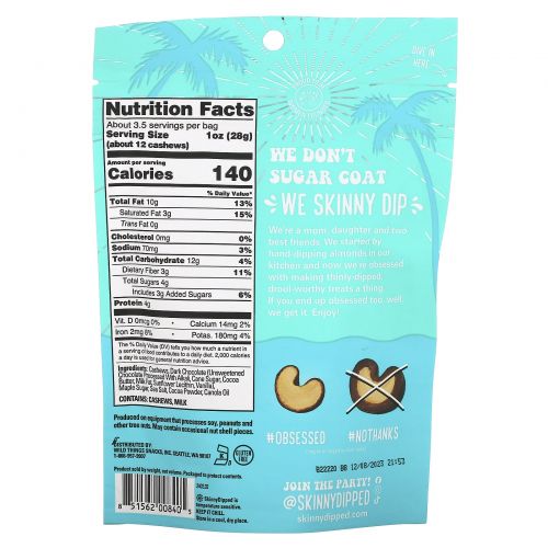 Описание товара SkinnyDipped, Skinny Dipped Cashews, Dark Chocolate Cocoa, 3.5 oz (99g)