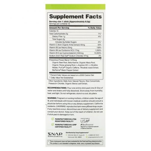 Описание товара Snap Supplements, Оксид азота, органическая свекла перед тренировкой, 10 пакетиков по 8,2 г (0,29 унции)