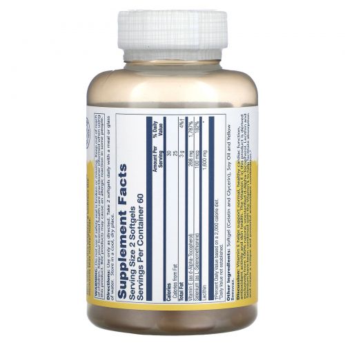 Описание. Витамин E в составе данного продукта получен из полностью натурального, неэстерифицированного d-альфа-токоферола. Кроме того, лецитин превращает витамин E в эмульсию, повышая его биодоступность. Селен в сочетании с витамином E усиливает усвояемость и выступает в качестве одного из компонентов уникальной и эффективной пары антиоксидантов.