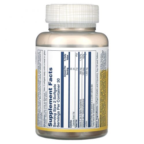 Описание. Витамин E помогает поддерживать нормальную работу сердца, антиоксидантную активность и здоровье кожи. Витамин Е в этом продукте получен исключительно из 100% натурального неэтерифицированного d-альфа-токоферола. Лецитин и селен объединены с витамином Е, чтобы облегчить усвоение и создать уникальную и мощную комбинацию антиоксидантов.