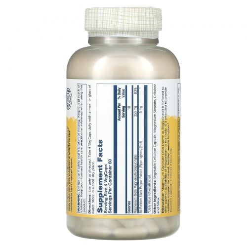 Описание товара Solaray, Глицинат магния для лучшего усвоения, 350 мг, 240 вегетарианских капсул