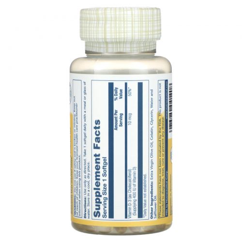 Описание товара Solaray, Витамин D-3, 10 мкг, 120 мягких таблеток