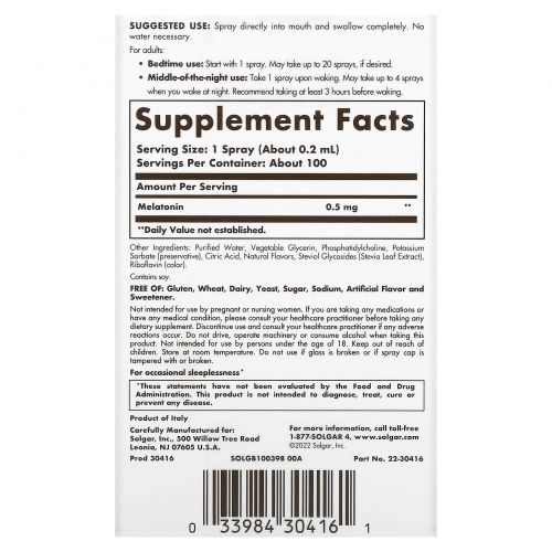 Описание товара Solgar, Liposoman Melatonin, спрей для сна, мягкая мята, 100 спреев для полости рта, 20 мл (0,68 жидк. Унции)