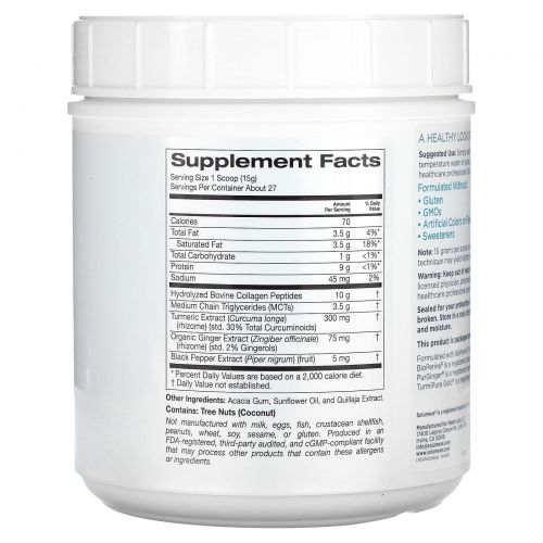 Описание товара Solumeve, пептиды гидролизованного коллагена с куркумой, 400 г (14 унций)