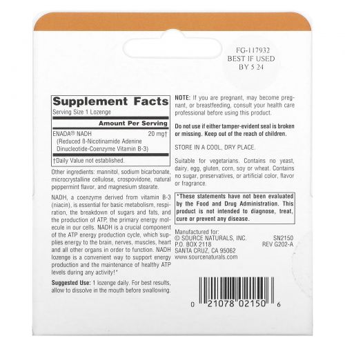 Описание товара Source Naturals, НАДН, 20 мг, 30 подъязычных таблеток
