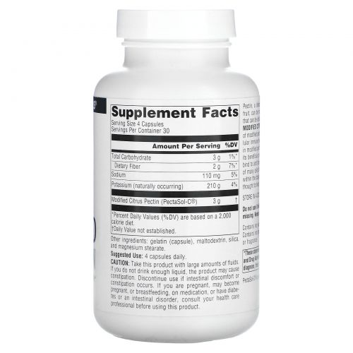 Пектин — это пищевая клетчатка, естественно присутствующая в цитрусовых фруктах. Ее можно модифицировать и создать более мелкие фрагменты, которые организм может использовать. Как показали исследования, модифицированный цитрусовый пектин от Source Naturals способствует укреплению иммунитета клеток. Считается, что фракции галактозила, обнаруженные в модифицированном пектине, обеспечивают его полезные свойства. Эти молекулы, по-видимому, связываются и блокируют галектин-3, лектин на поверхности многих клеток, который способствует перемещению клеток в организме. Считается, что эти свойства связывания лектина способствуют укреплению здоровья.