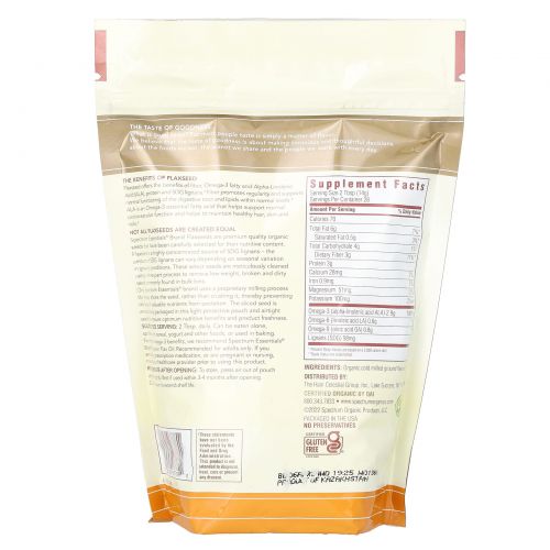 Spectrum Essentials® Brand Flaxseeds are premium quality organic seeds that have been carefully selected for their nutritive content. Flaxseed is a highly concentrated source of SDG lignans— the amount of SDG lignans can vary from 0.7%-1.9% of seed weight depending on seasonal variation and growing conditions. These select seeds are meticulously cleaned using a three-part process to remove low weight, broken, and dirty seeds commonly found in bulk bins. Only Spectrum Essentials® brand uses a proprietary milling process that finely slices the seed, rather than crushing it, thereby preventing the loss of valuable nutrients from oxidation. The sliced seed is immediately packaged in this light protective pouch and airtight sealed to ensure optimum nutritive benefits and product freshness.