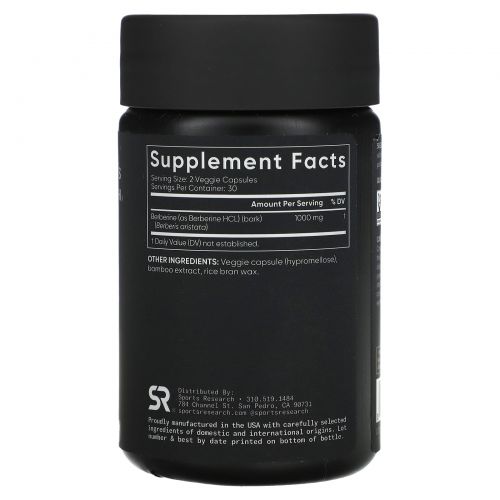 Sports Research, берберин, 1000 мг, 60 растительных капсул (500 мг в 1 капсуле)